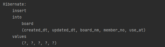 위의 작업을 한 뒤 boardRepository의 save를 호출하면 콘솔에 아래와 같이 실제 쿼리가 실행이 된 것을 확인할 수 있다,